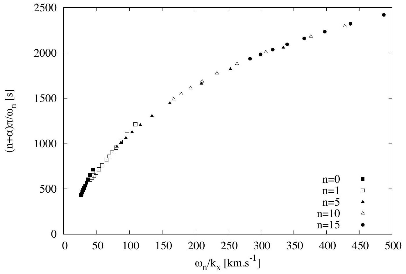 La figure 3 représente les mesures de l'instrument MDI, où on a porté en abscisse et en ordonnée . La constante a été ajustée à la valeur qui permet que les points correspondant à des valeurs de différentes se retrouvent approximativement sur la même courbe.